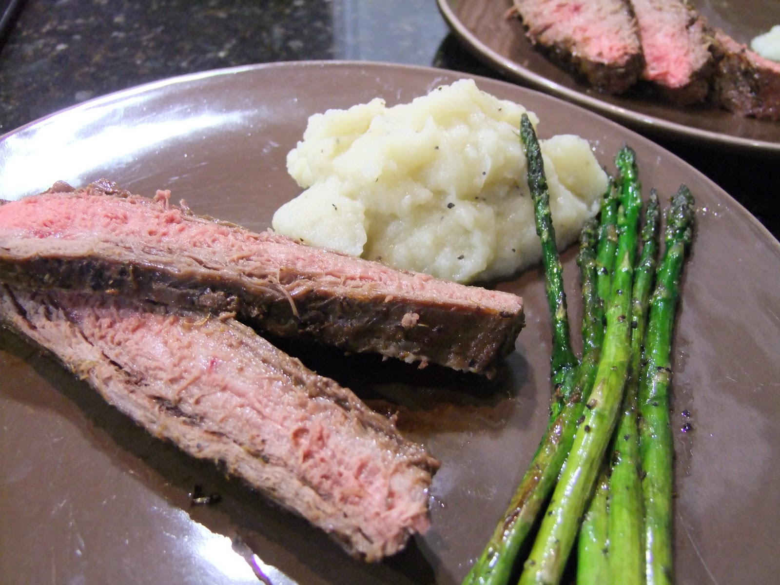 Tonight I made Garlic and herb marinated Flank steak, Mashed Cauliflower and Asparagus. This was my attempt at having a hearty steak and potatoes dinner (just like a gourmet steak house, except on my couch watching Christmas movies!!!!!)  The steak was flavorful and juicy, I am in love. Brandon is a steak and potatoes kind of guy and he really enjoyed this meal and has requested to have it more often. I know he was missing potatoes but I think he will be Just Fine.