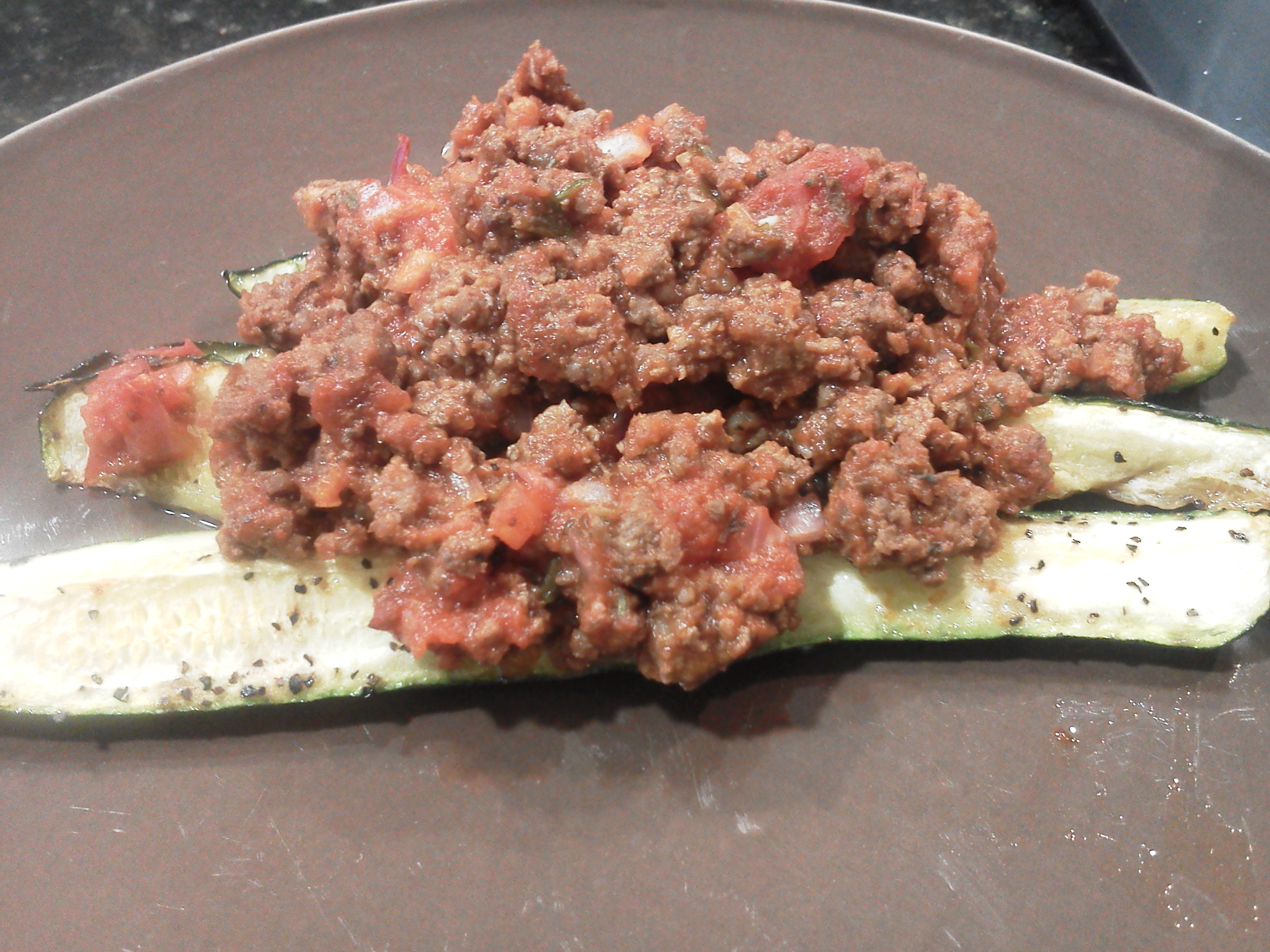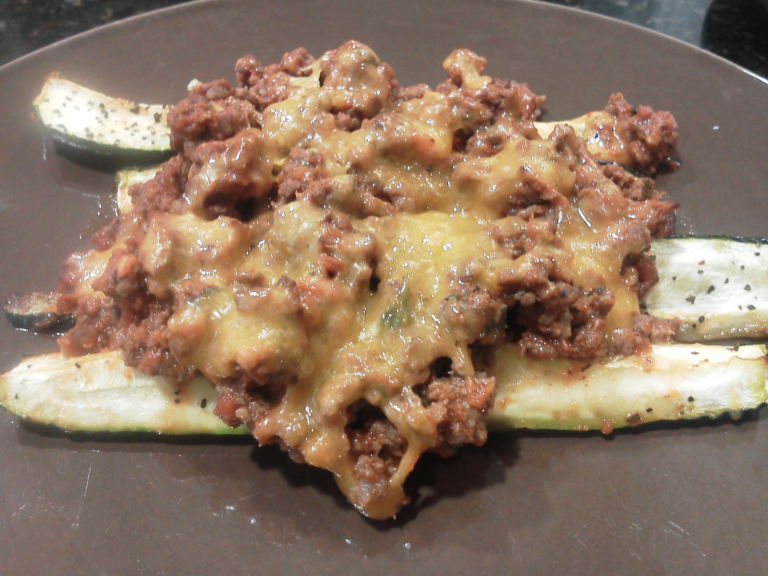- When Zucchini is tender, remove it from the oven and top it with the meat sauce (*and Cheese if desired).