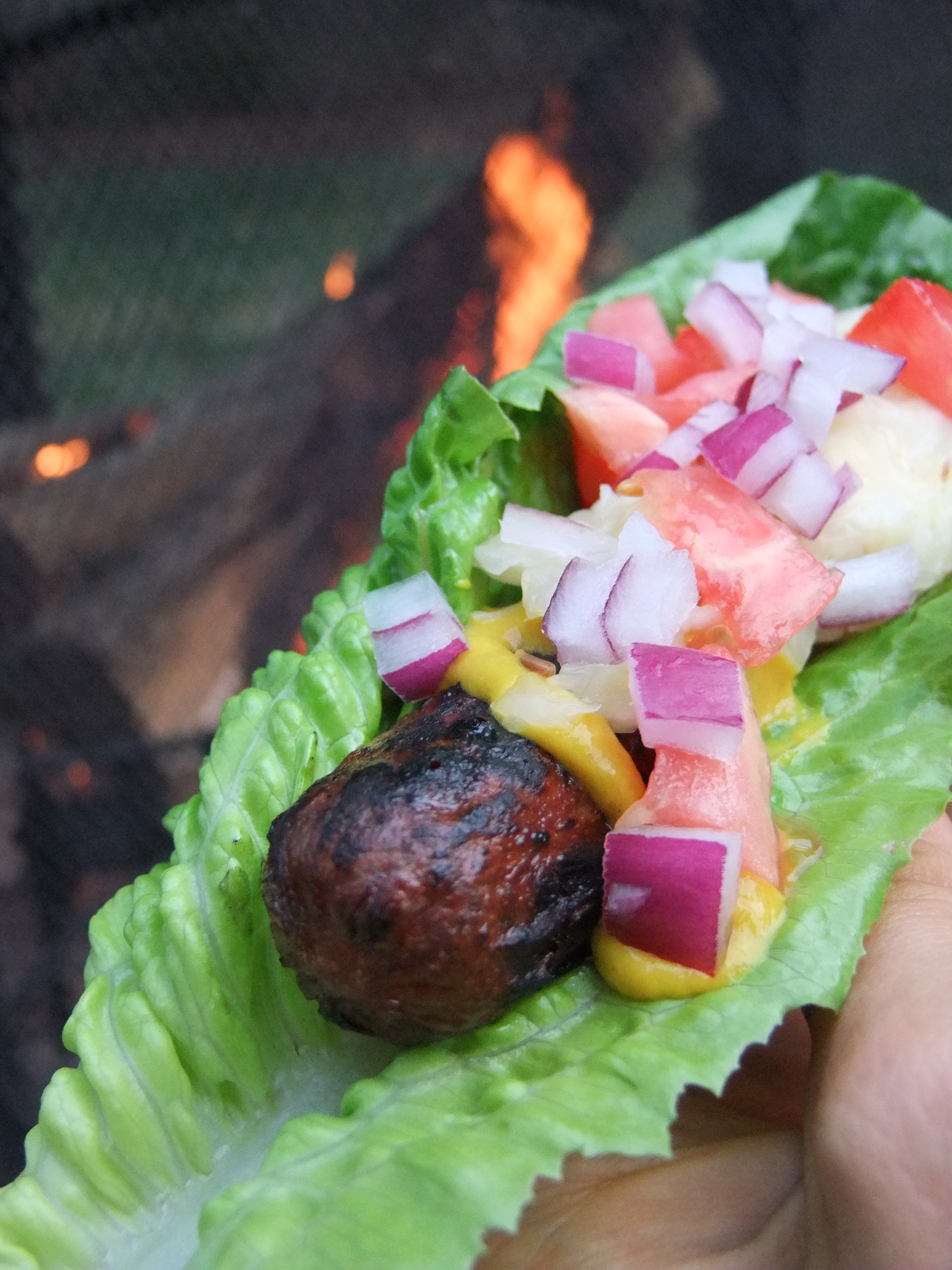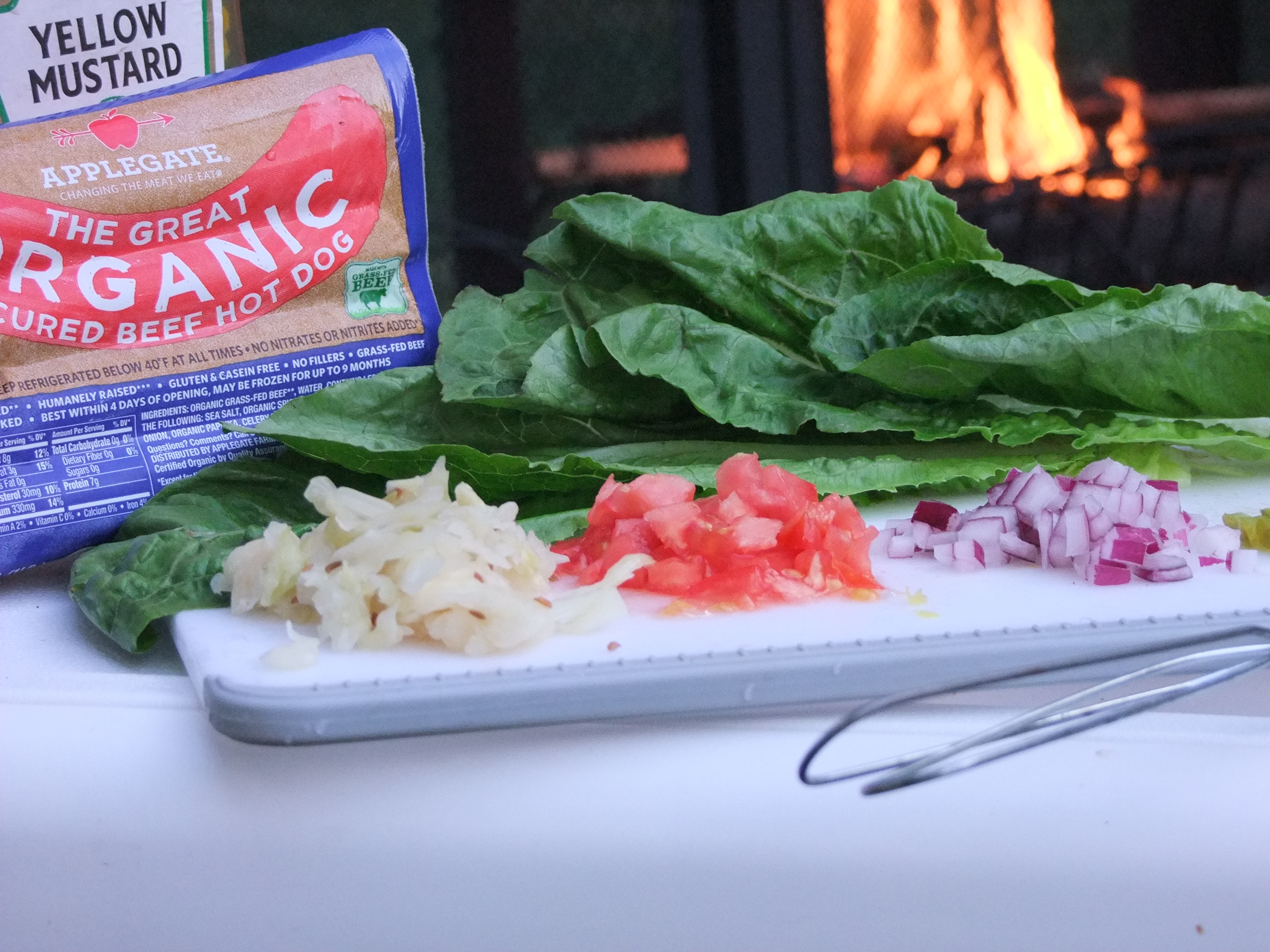 Romaine lettuce, Applegate hot dog, onion, tomato, kraut and Heinz yellow mustard. This tasted like summertime!