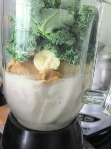 I have been reading about the benefits of Kale lately and have been looking for new ways to add it into my diet. After reading this article I decided to share how I get Kale into my diet at least 3 times a week. I generally make this smoothie for breakfast or for Pre or post intense workout. Caution- it is surprisingly filling!