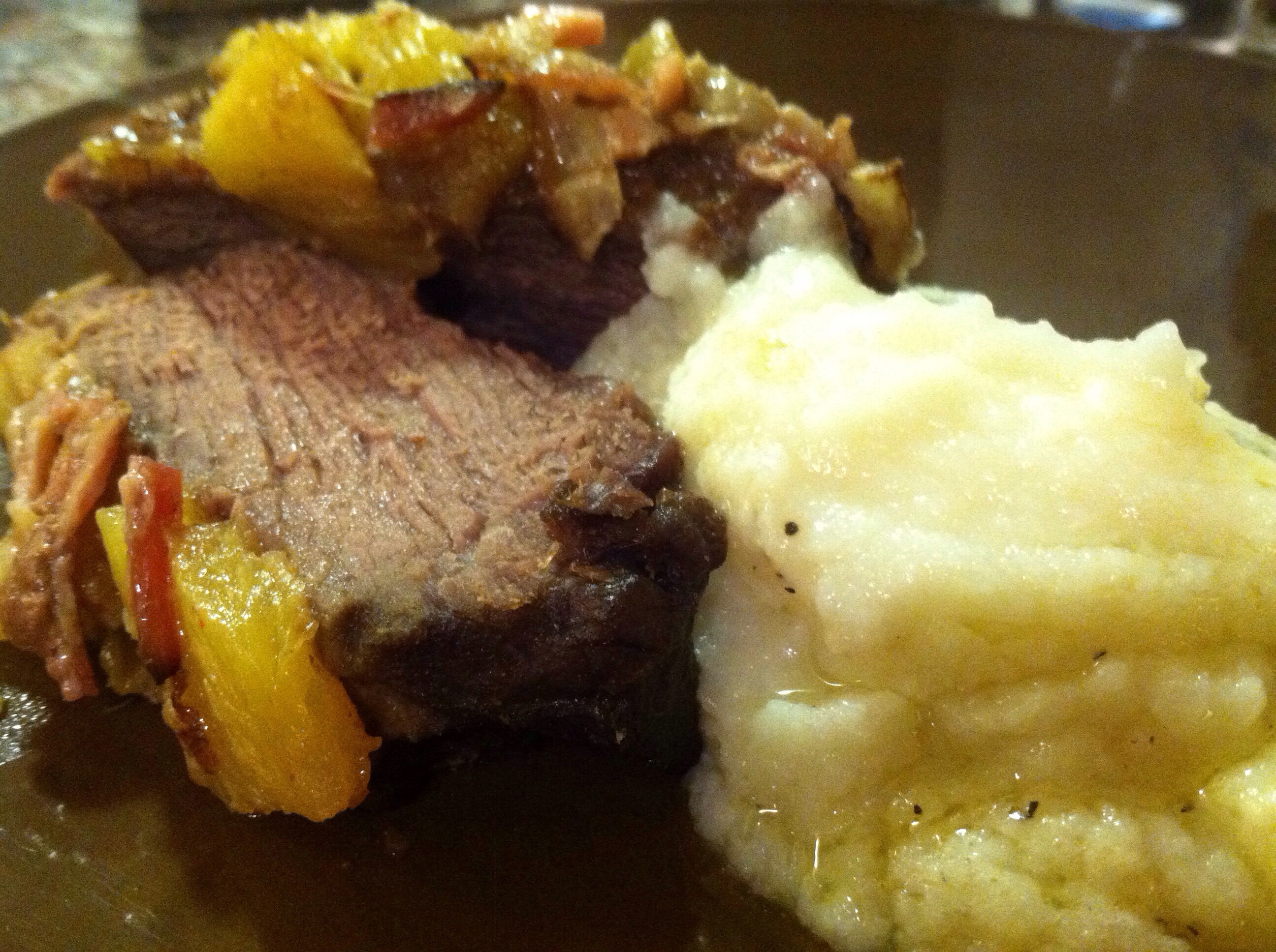 This recipe was done in the oven but could easily be converted to a crock pot recipe by adding a cup of water.