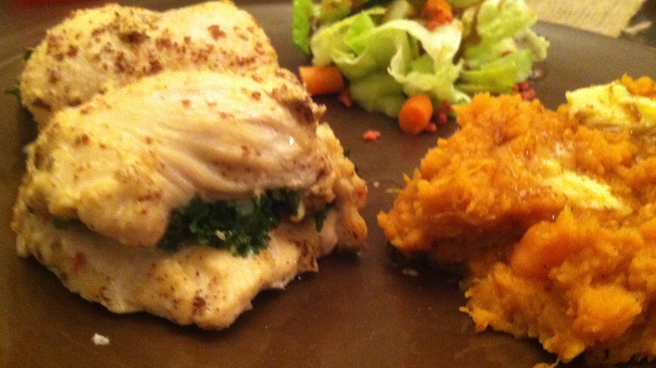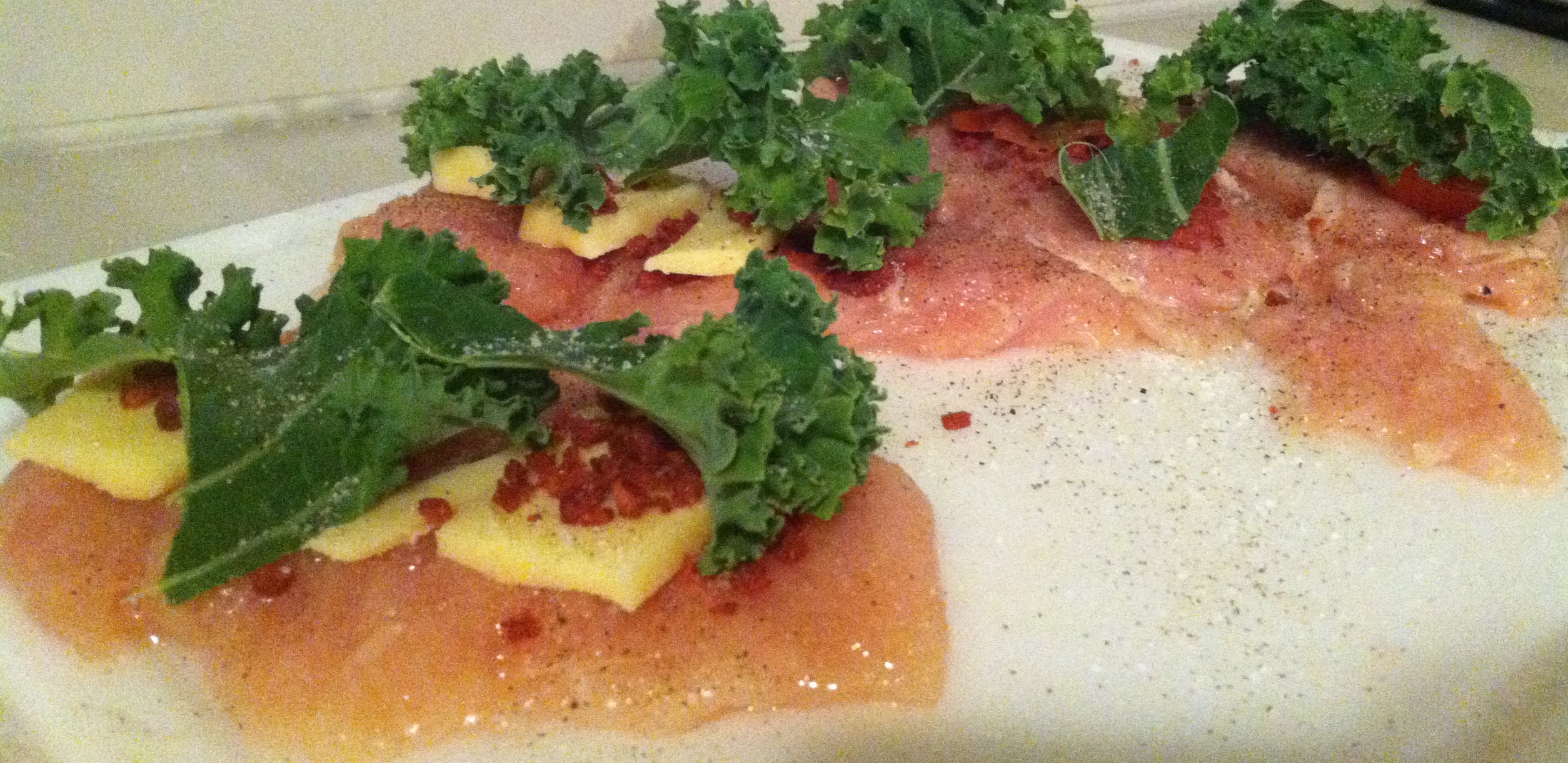 - Layer each breast with 1 Tbsp. of Bacon, Kale and Tomato slices
