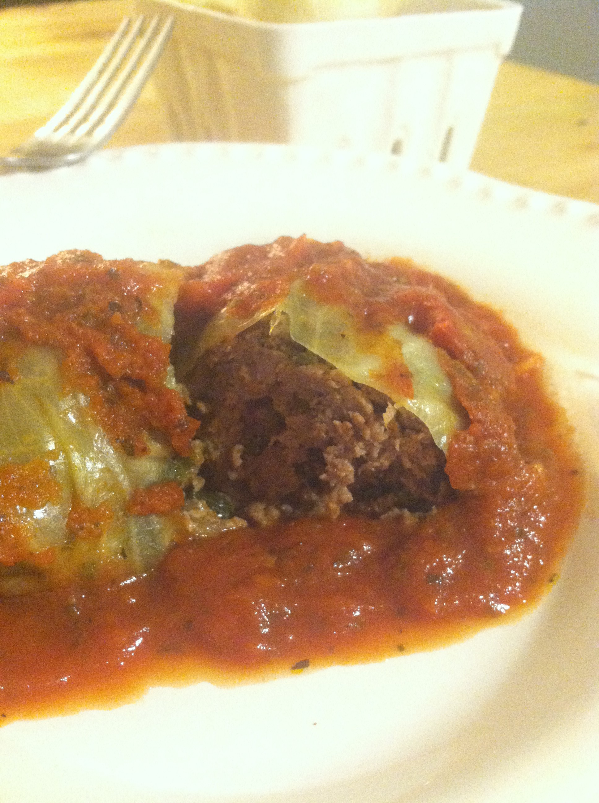 - Lay out your cabbage leaves so that the end of the stem is facing up at you. Take 1/3 C. of the Venison mixture and place it in the leaf.